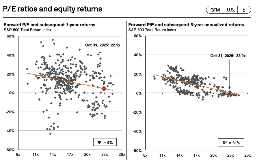 We will keep it short and sweet this week; The below chart from JP Morgan’s research department shows that for 5-year annualized returns a much stronger, clearly visible inverse correlation between the starting forward P/E ratio and the subsequent returns. The higher the starting P/E, the lower the average annualized return tends to be over the next five years. The specific data point we would like to highlight—, the current forward P/E of around 23 times earnings—sits historically at the point where the subsequent 5-year annualized return has clustered around 0% (ranging roughly from -2% to +2%). Investors should consider this as it pertains to their S&P 500 centric porfolios, which if history is any guidance are highly likely to endure flat returns for the next 5 years or so.